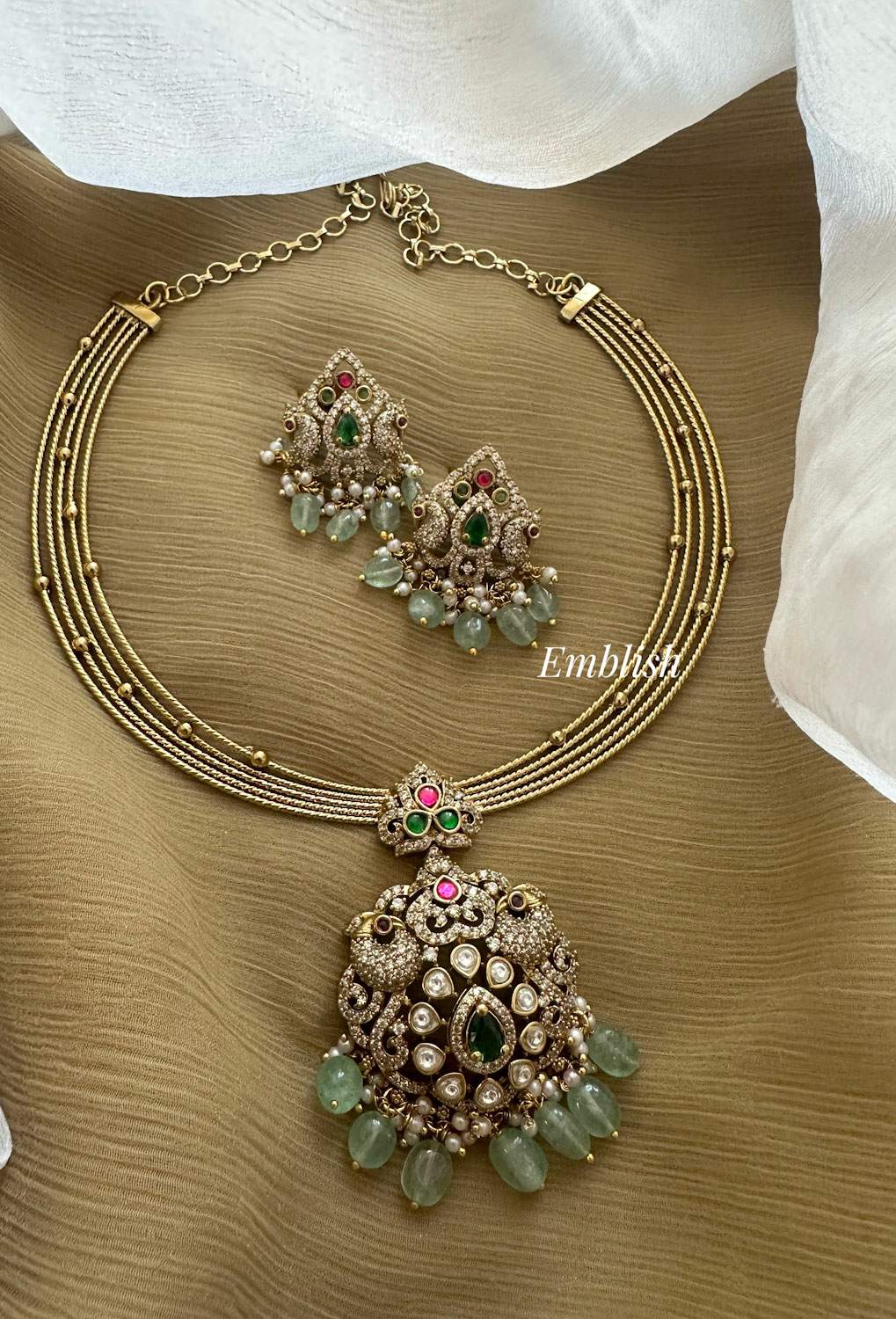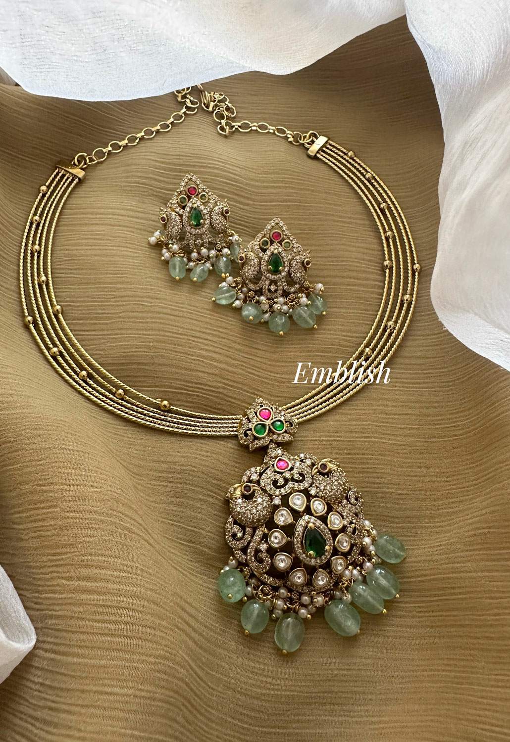 Victorian Kundan Jadau Flower Double Peacock Pendant Pastel Bead Hasli Set