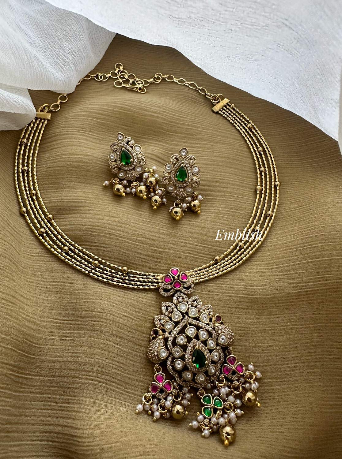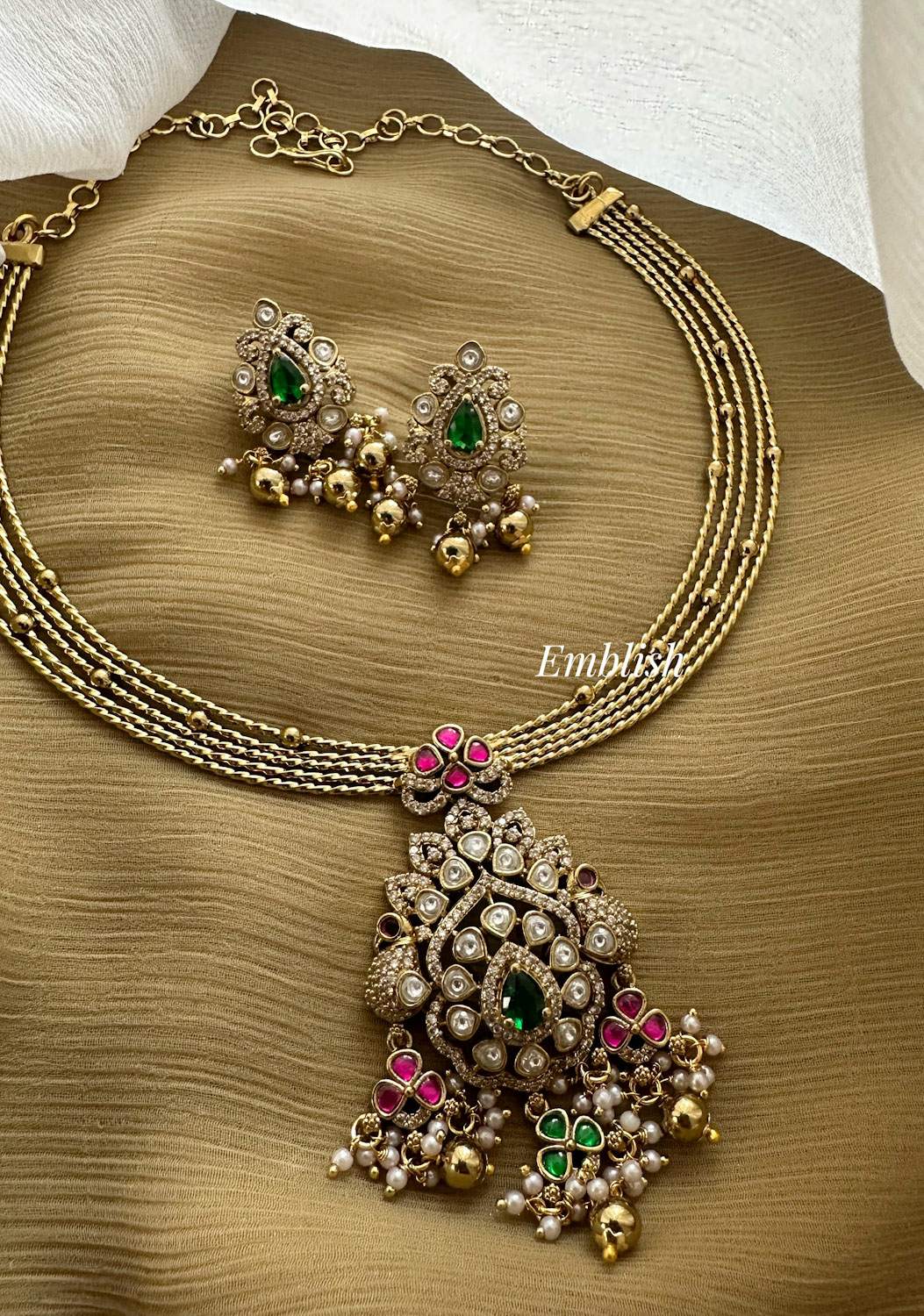 Victorian Kundan Jadau Flower Peacock Pendant Hasli Set - Gold Beads