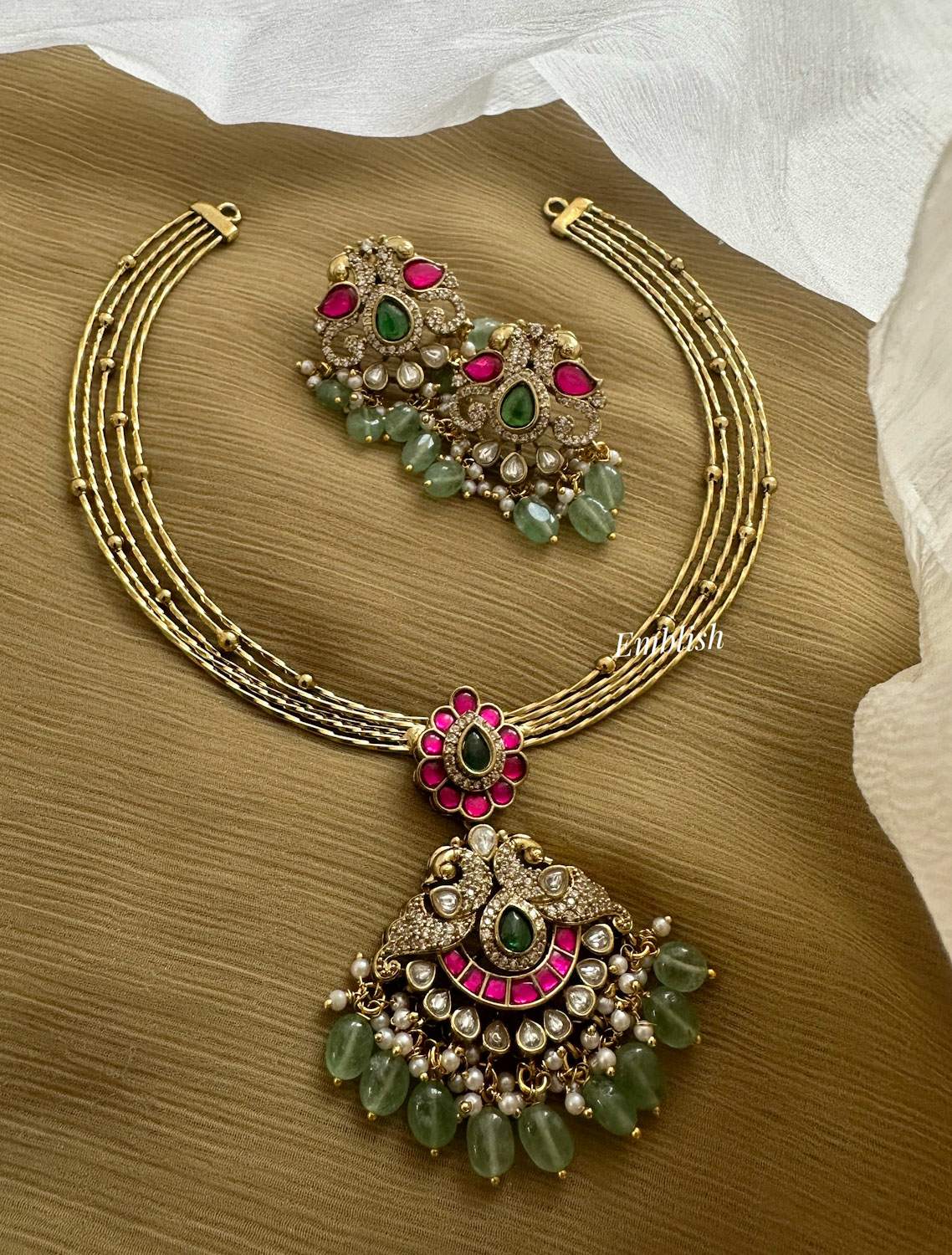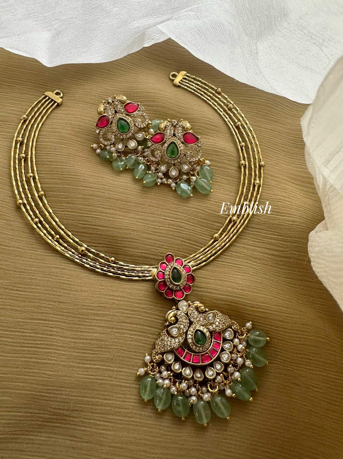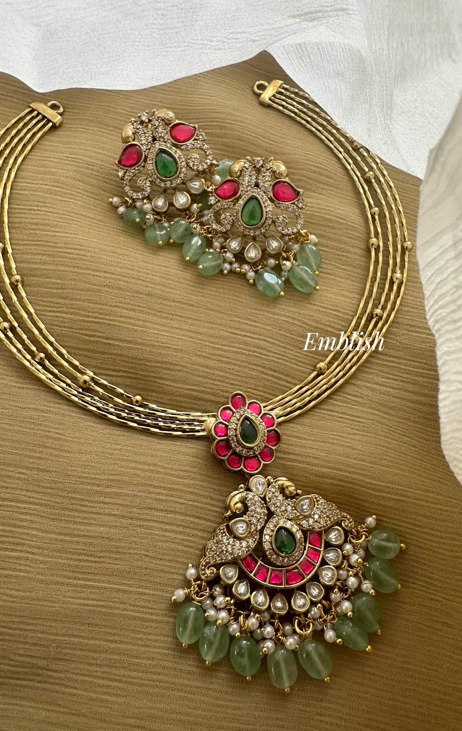 Antique Kundan Jadau Double Peacock Pendant AD Flower Hasli Neckpiece - Pastel Beads