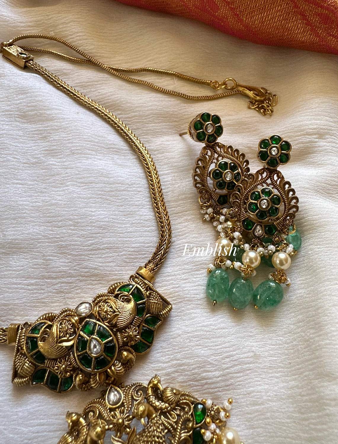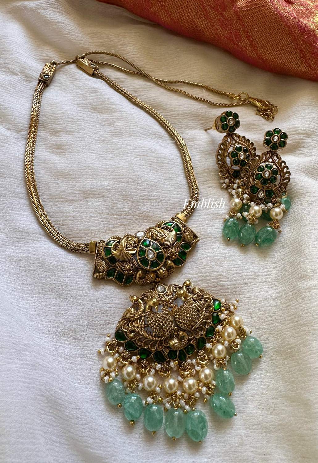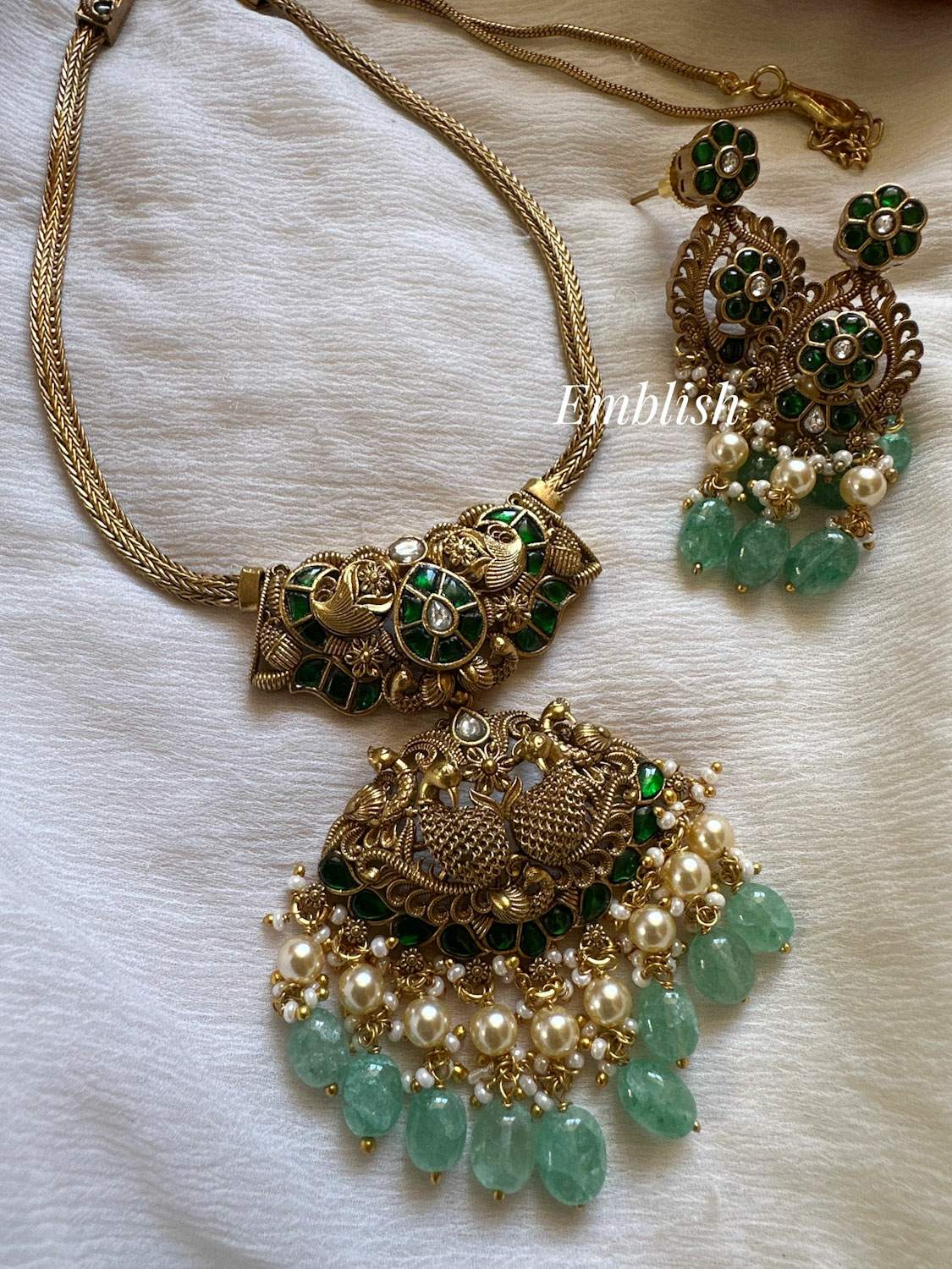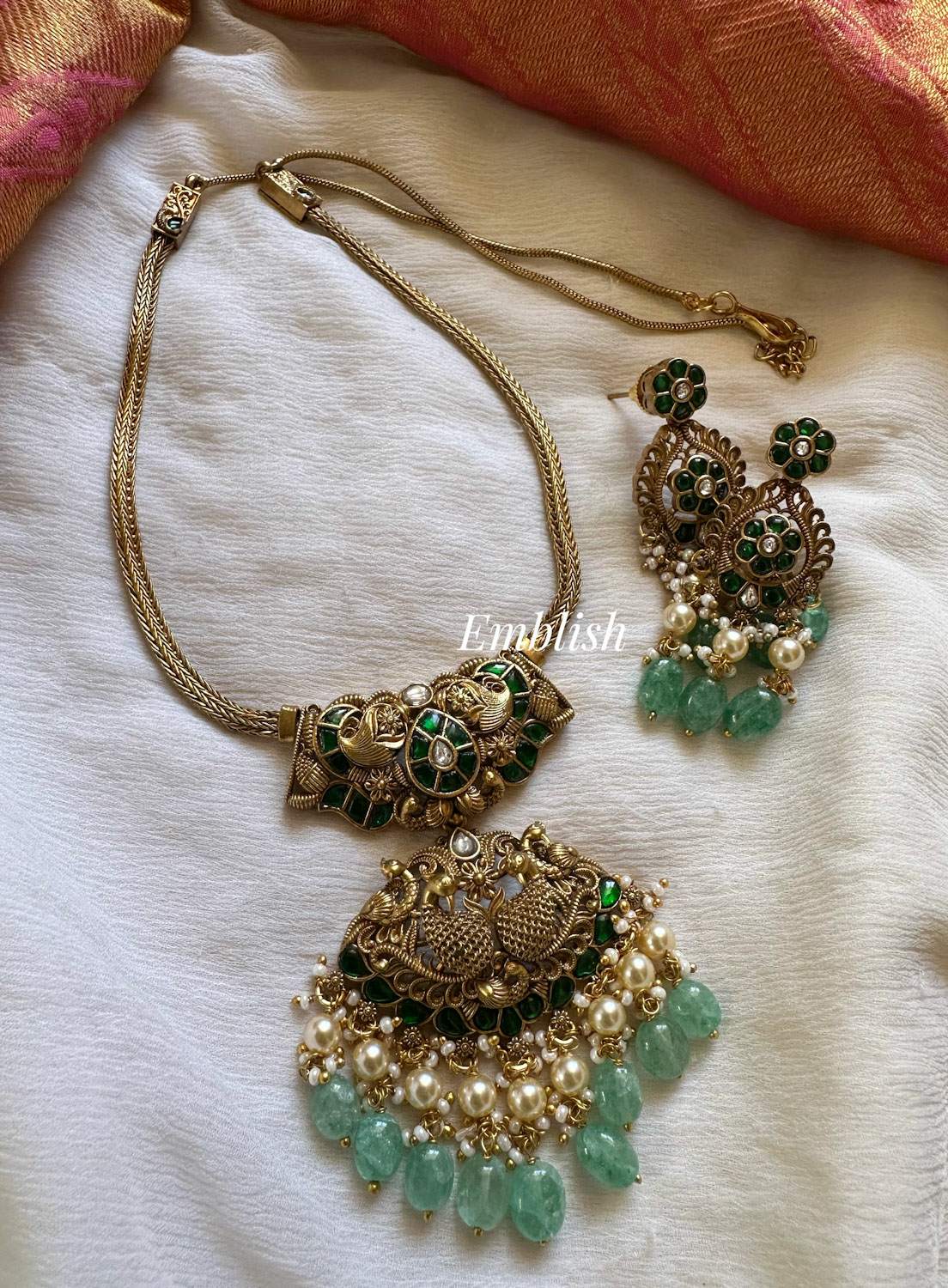Elegant Kundan Jadau Antique Lakshmi Pastel Bead Pendant Set - Green